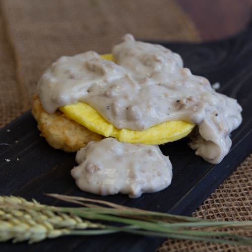 Soft biscuits smothered with hot, homemade sausage gravy. Available with 2, 3, 4 or 5 biscuits.